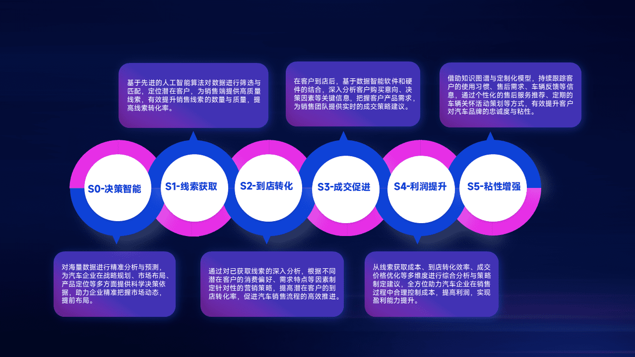基于销售转化漏斗的薄弱环节,,为客户提供数据+模型+运营的智能应用,,实现销售业绩的提升;推动线索管理全链路的精细化管理和运营。。。。